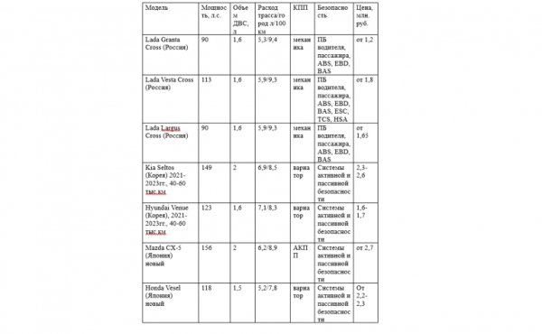 Информация в таблицах приведена для автомобилей с передним приводом. Также по всем приведенным машинам есть модификации с полным приводом (которые несколько дороже).