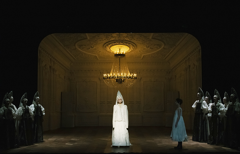 Необычный ход — через аскетизм декораций первого действия он акцентирует внимание зрителя на образах героев, второе действие наполнено торжественностью события женитьбы и в то же время, грустным исходом происходящего.